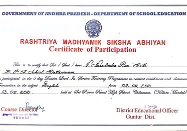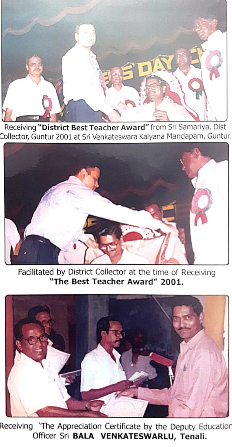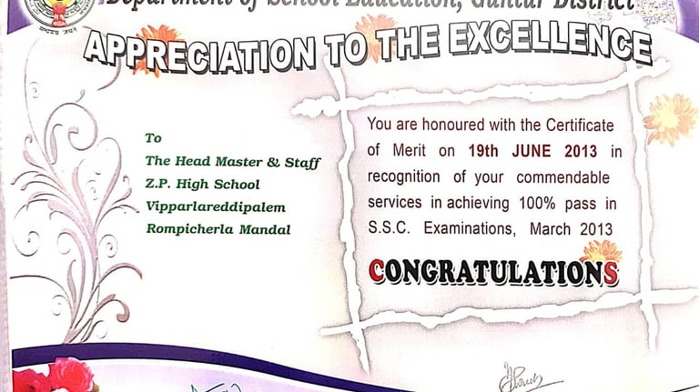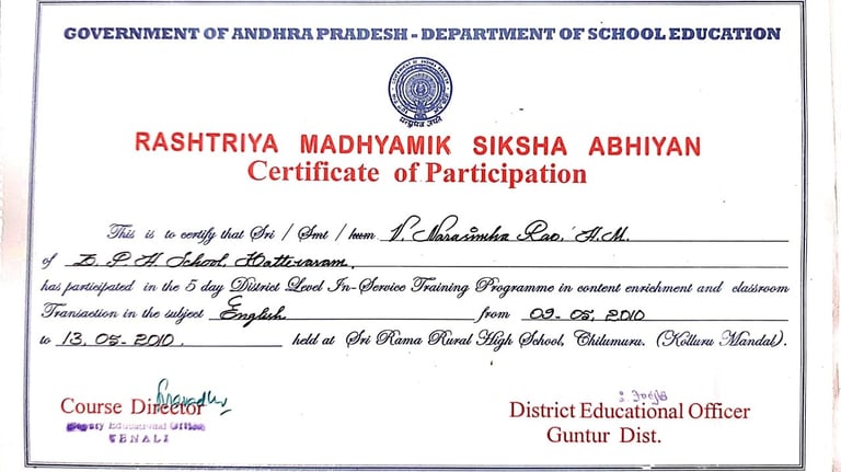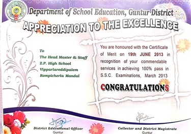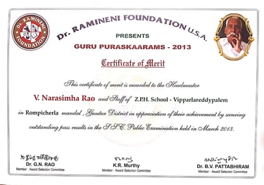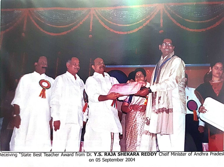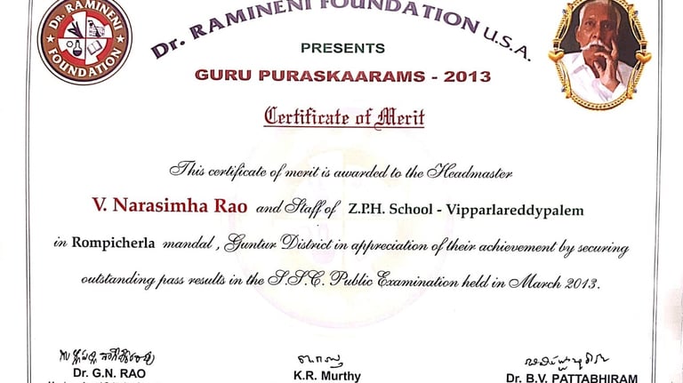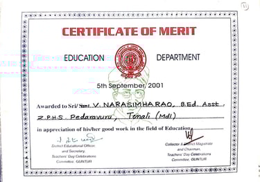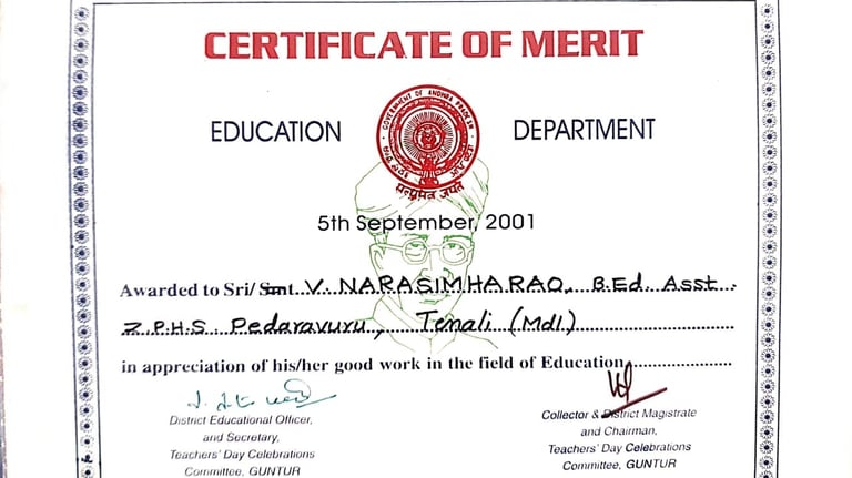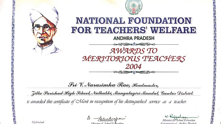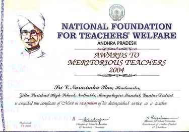 Narasimha Rao sir has been recognized with numerous prestigious awards and accolades throughout his illustrious career. He received the State Best Teacher Award from Dr. Y.S. Rajasekhara Reddy, Chief Minister of Andhra Pradesh, on September 5, 2004, and was honored with the District Best Teacher Award by Sri Samariya in Guntur in 2001. Additionally, he was facilitated by the District Collector for this achievement and received an Appreciation Certificate from Deputy Education Officer Sri Bala Venkateswarlu of Tenali. The Guru Puraskar Award from Ramineni Foundations recognized his exceptional contribution to achieving 100% SSC results. Other notable recognitions include facilitation by Mangalagiri mandal staff at his house opening in Vijayawada, participation in the National Green Corps Programme at Z.P. High School, Nutakki, and facilitation by Sri Murugu Hanumantha Rao M.L.A. during Buddha Jayanti Celebrations in 2005. He was also honored by Sri Mudraboyina Venkateswara Rao M.L.A. with a garland and received a present from Boudha Trusty during the 4th Buddha Jayanti Celebrations at Mangalagiri in 2005. Each of these awards underscores his dedication to education and his significant impact on his community.